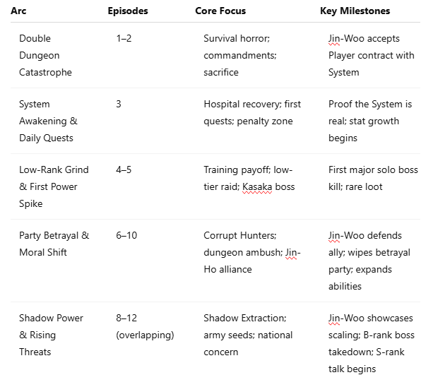 Core Arcs: Double Dungeon (Episodes 1–2), System Awakening (3–4), Early Growth (5–6), Betrayal Raid (7–9), Shadow Extraction & Rising Threats (10–12).